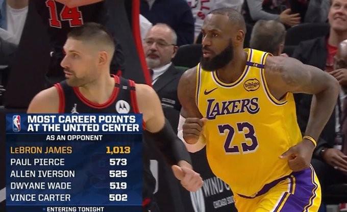 北京时间今日,在NBA常规赛中,洛杉矶湖人队在客场对阵芝加哥公牛队。本场比赛直播期间,转播方晒出了一组数据,数据为NBA历史上作客芝加哥公牛队主场联合中心的客队球员总得分排行榜。其中,詹姆斯以1013分高居榜首,断档领先第二名保罗-皮尔斯的573分。客战公牛球员总得分排行榜1、詹姆斯 1013分2、皮尔斯 573分3、艾弗森 525分4、韦德 519分5、文...