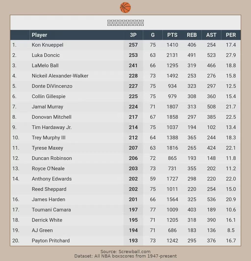 最近两场比赛,克尼佩尔三分球合计9中1,本赛季至今合计三分球596中257,命中数高居联盟榜首;东契奇则是三分球合计687中253,命中数位列联盟第二。