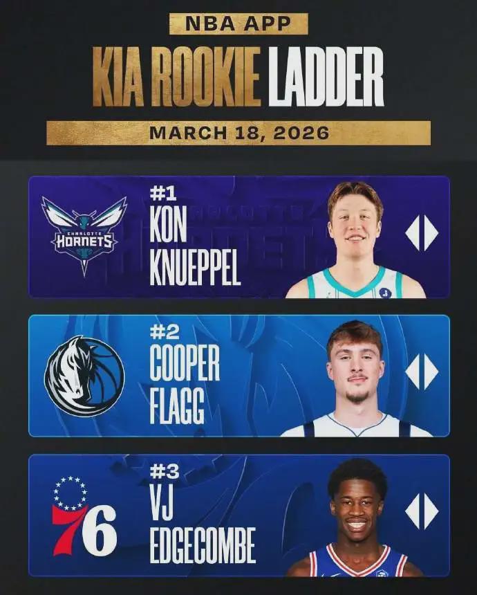 个人数据和带队成绩双双爆发,让克尼佩尔在新秀榜始终占据第一位置,力压“美国之子”25届状元秀弗拉格,后者本赛季至今出战64场比赛,场均上阵33.8分钟得到20.3分6.6板4.5助1.2断,三项命中率46.7%、27.8%和81.2%,独行侠以24胜52负已彻底无缘附加赛。